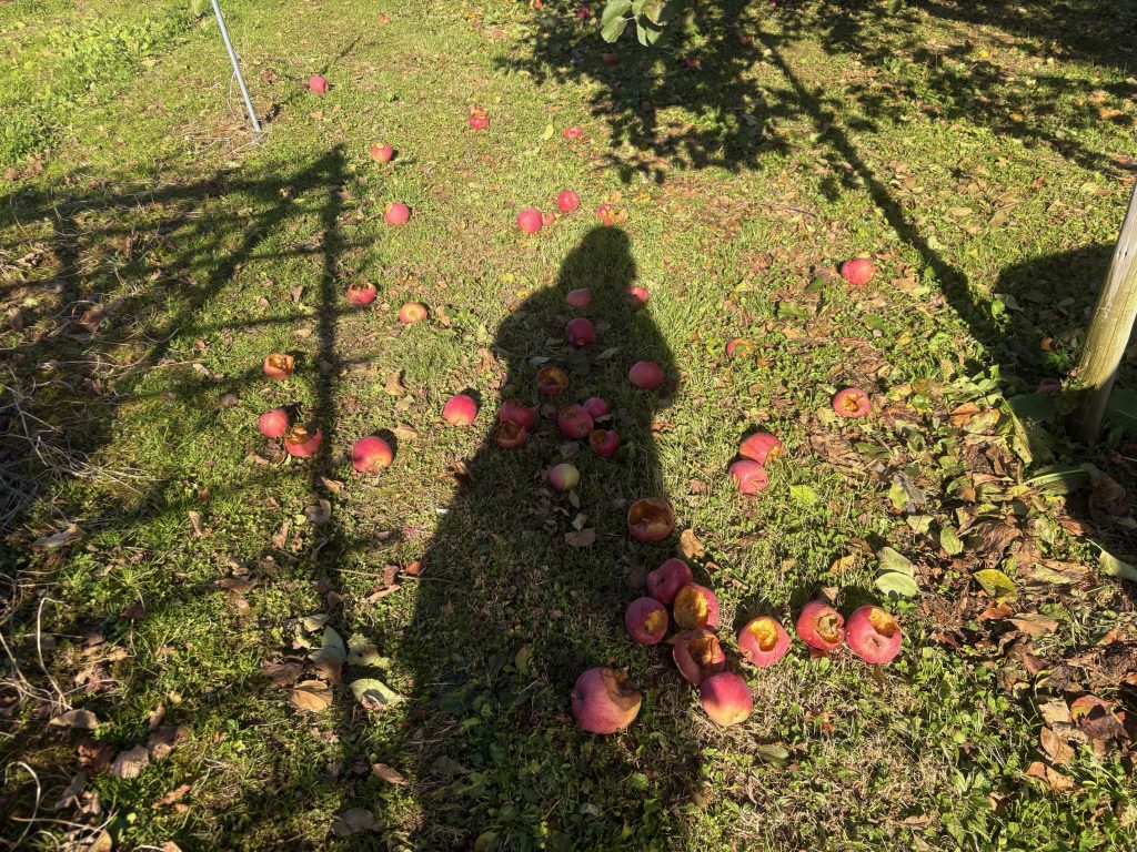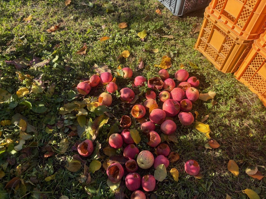 下に落ちた実がやられているのが獣害です。
