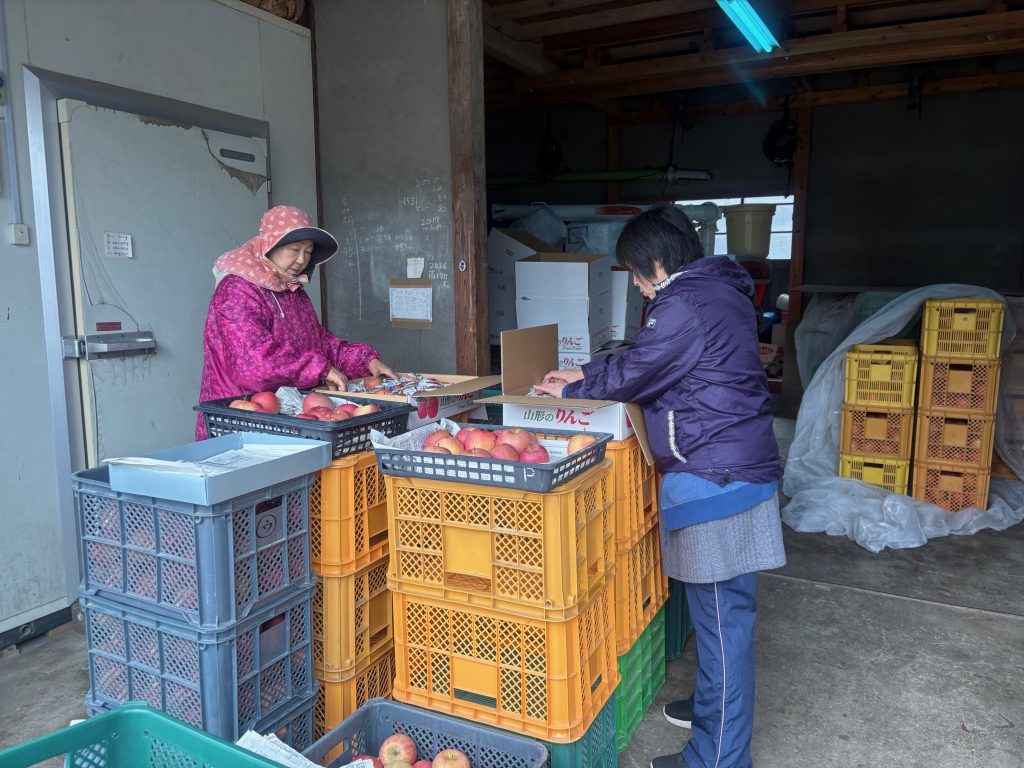 今は収穫してきたリンゴのフジの選別をしています。