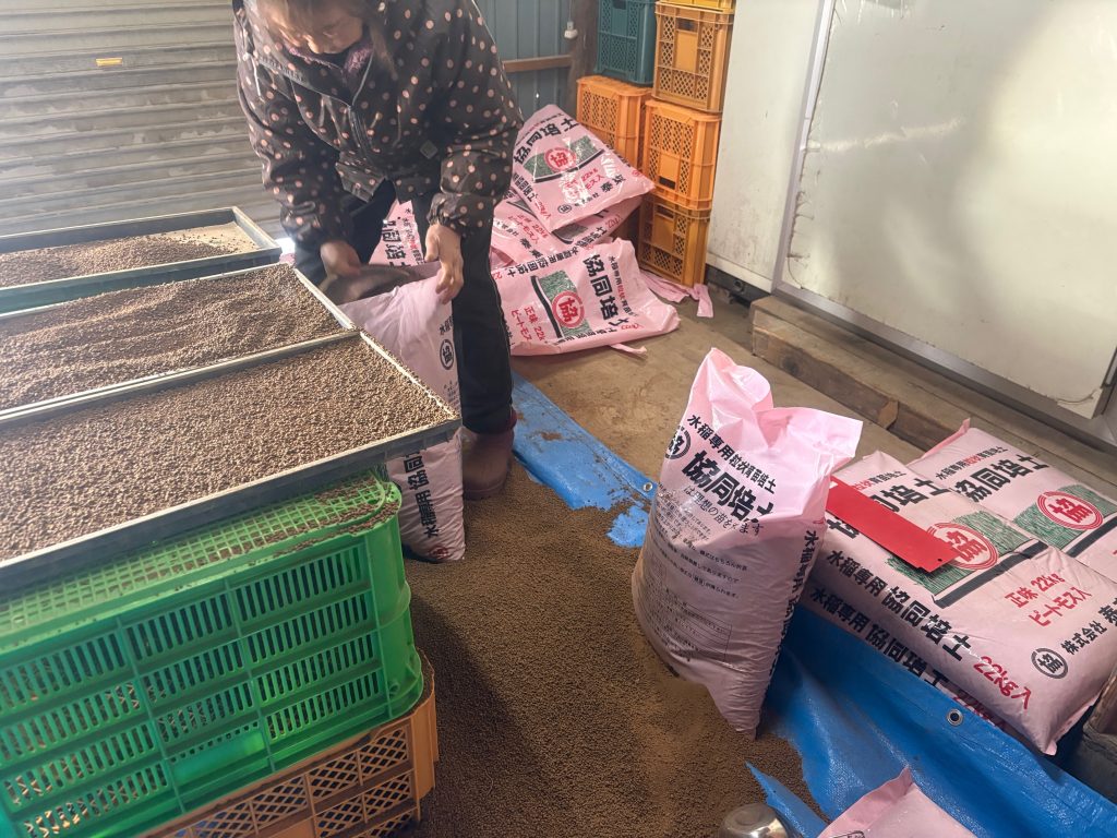 田んぼの苗作りのために苗箱に土を詰める作業をしています。