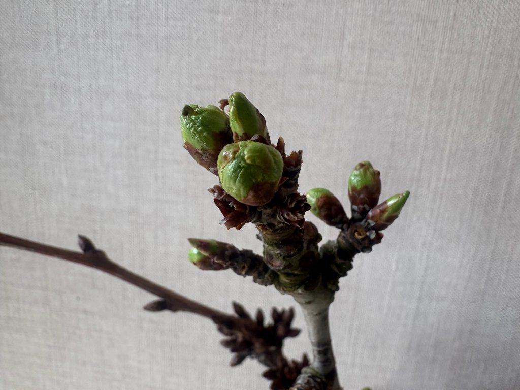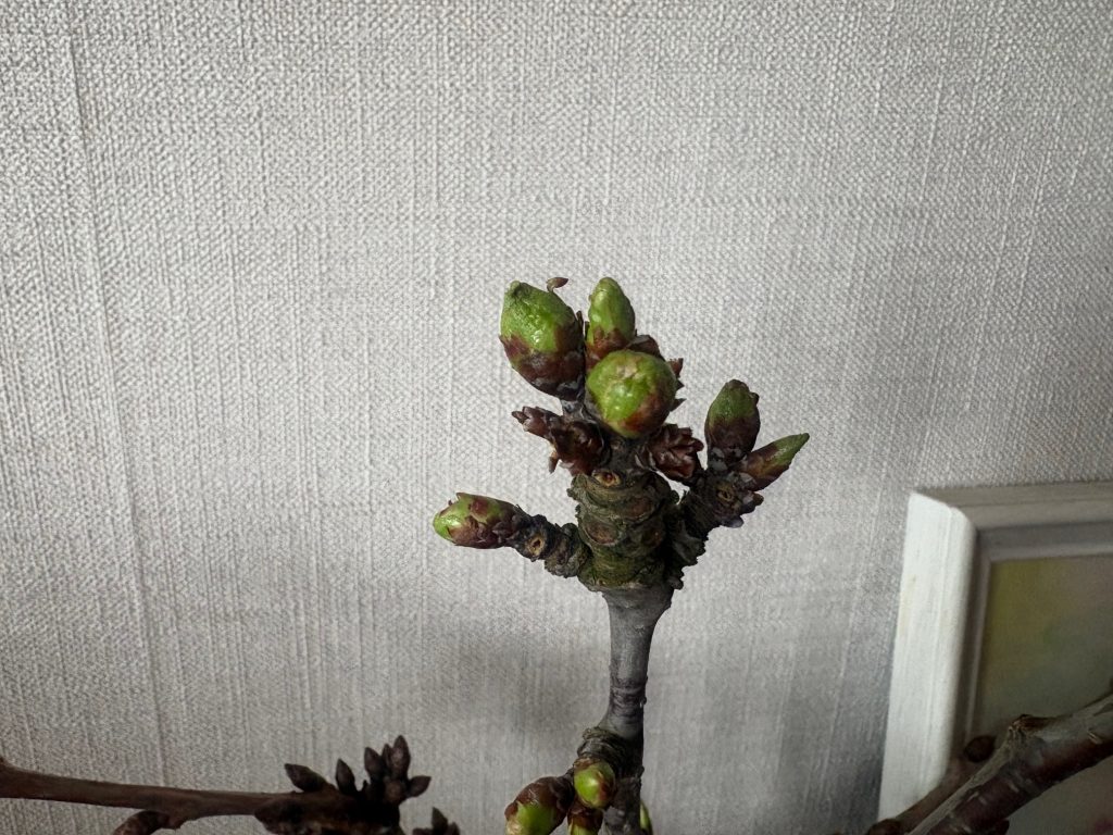 玄関の切り枝にした紅秀峰のつぼみが膨らんでいます。