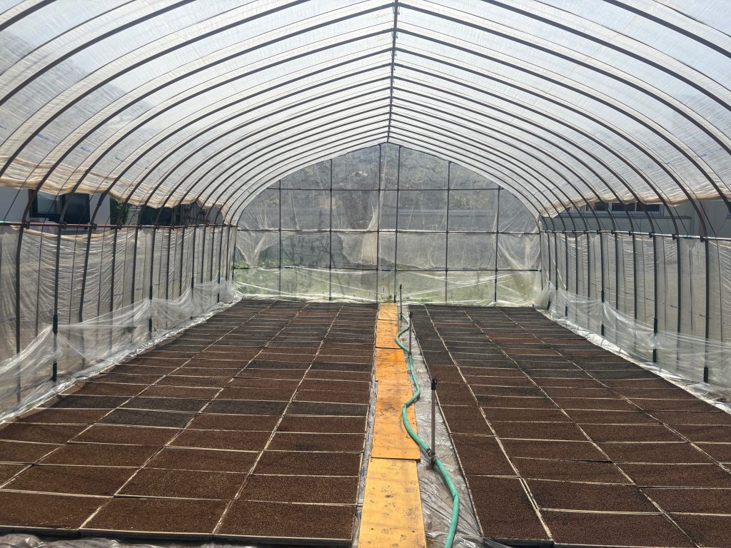 育苗器(いくびょうき)から苗箱をハウスに並べる作業です。