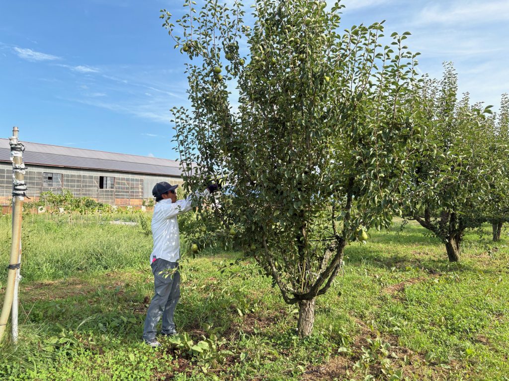 ラフランス畑にキラキラ糸をはりました。