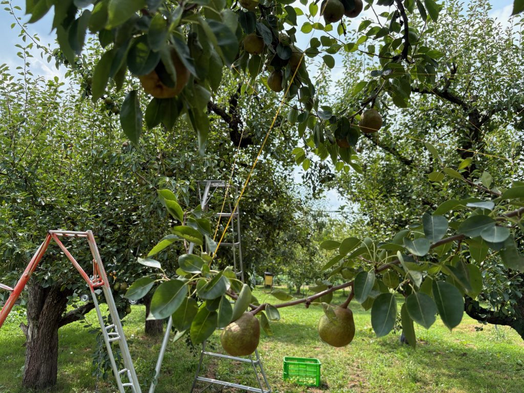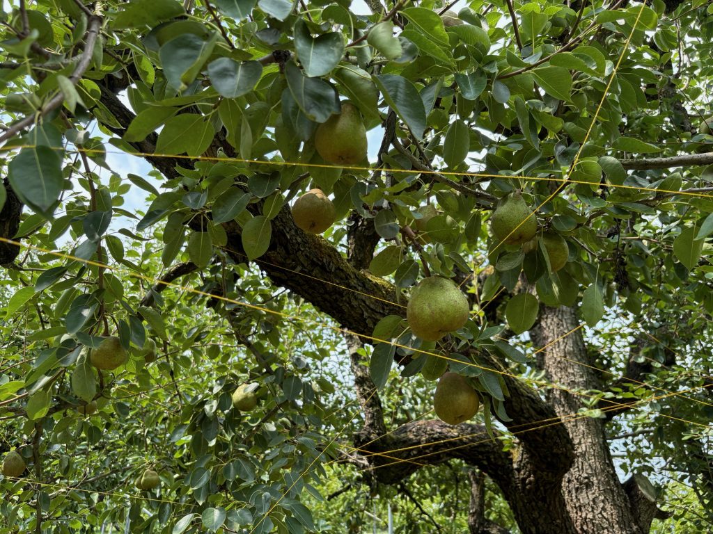 ラフランスの木、1本1本に糸を張っていきます。